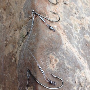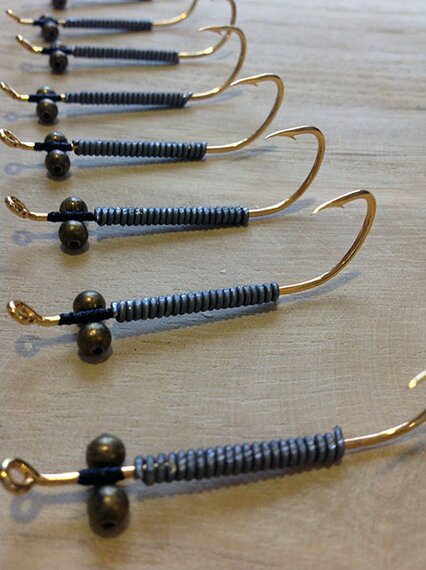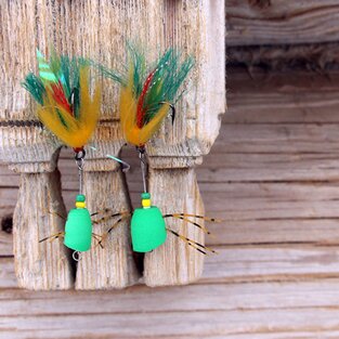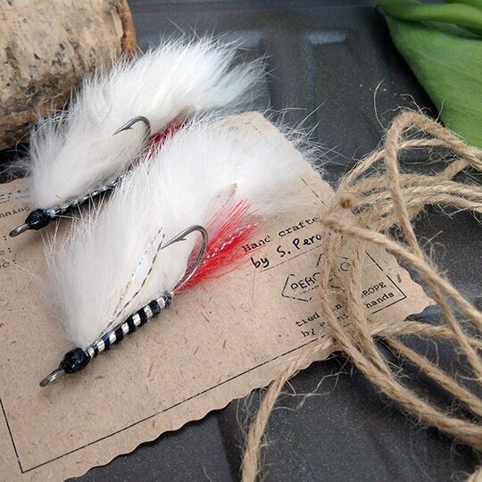 Изготавливается на надежных, позолоченных крючках с удлиненным цевьем Eagle claw из полос кроличьего меха белого, черного, рыжего, коричневого, серого, и бежевого натурального оттенка меха, продольного кроя. По умолчанию изготавливается с огрузкой свинцовой проволокой и металличесими глазками, но на заказ может быть изготовлен и без огрузки и даже наооборот, в "разгруженном" формате, с добавлением элементов с положительной плавучестью.